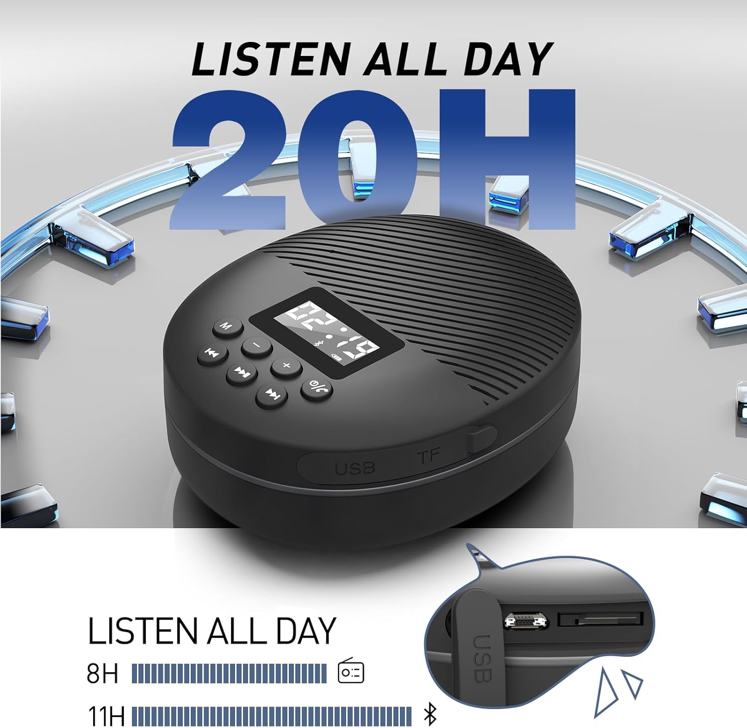 • 【LCD Display Screen & IPX5 Water Resistant】The LCD Screen can display time anytime. Note: Only support 24H mode time display. Radio and time is alternate display! IPX5 water resistant can survive accidental splashes at home, pools, beaches or anywhere. Lower power voice prompt & 8 mins power off mode enable the battery to last for a long time. No worry of out of power when hiking, camping or at travel.