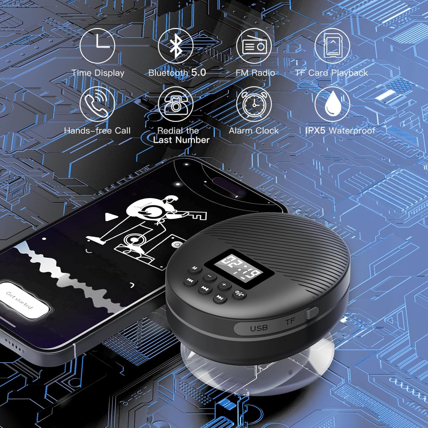 Shower Radio Speaker with Bluetooth 5.0, Waterproof Wireless Bathroom FM with Suction Cup 12H Long Playback Time, Lanyard, LCD Screen Display, Handsfree Calling, Storage Card Playback Black